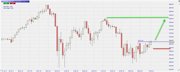 Kann der Future nach der Erholung der letzten Tage nun auch den Widerstand bei 2672 auf Tagesbasis knacken (blaue Linie), dann steht der Weg offen für eine neue Rallye.