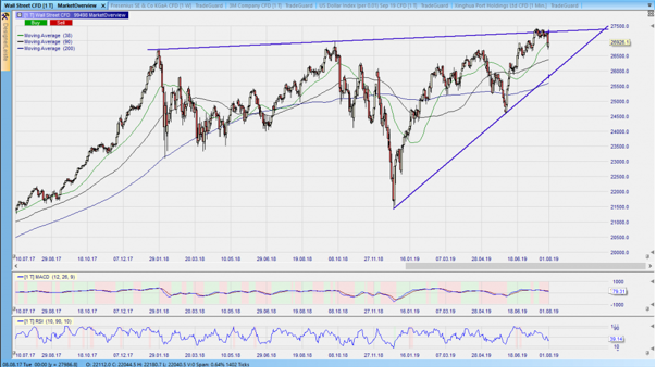 Kurzfristig ist der Aufwärtstrend mit der gestrigen Tageskerze hinfällig. Anleger sollten sich auf eine Korrektur einstellen, insbesondere wenn der Dow die 38-Tage-Linie bei 26.782 Punkten nachhaltig unterschreitet, wo sich außerdem das ehemalige Ausbruchsniveau bei 26.678 Punkten befindet.