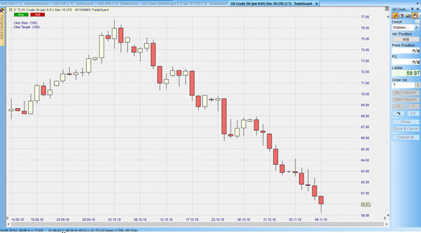 November 2018. Ausgehend vom Abwärtstrend seit 2008 ist der Ölpreis WTI in eine dynamische Abwärtsbewegung übergegangen. So verlor das schwarze Gold in den letzten 6 Wochen gut 16 Dollar. Auf eine Bodenbildung zu spekulieren wäre so als wenn man die Nadel im Heuhaufen finden möchte. Es ist aussichtslos. Wir als technische Trader wollen aber mögliche Reaktionspunkte im Chart ausmachen und ein solcher könnte genau bei 58,90 Dollar liegen. Bitte nageln Sie mich jetzt aber bitte nicht genau auf diese Marke fest, da ein kurzfristiges Unterschießen bei solch dynamischen Bewegungen immer möglich ist.